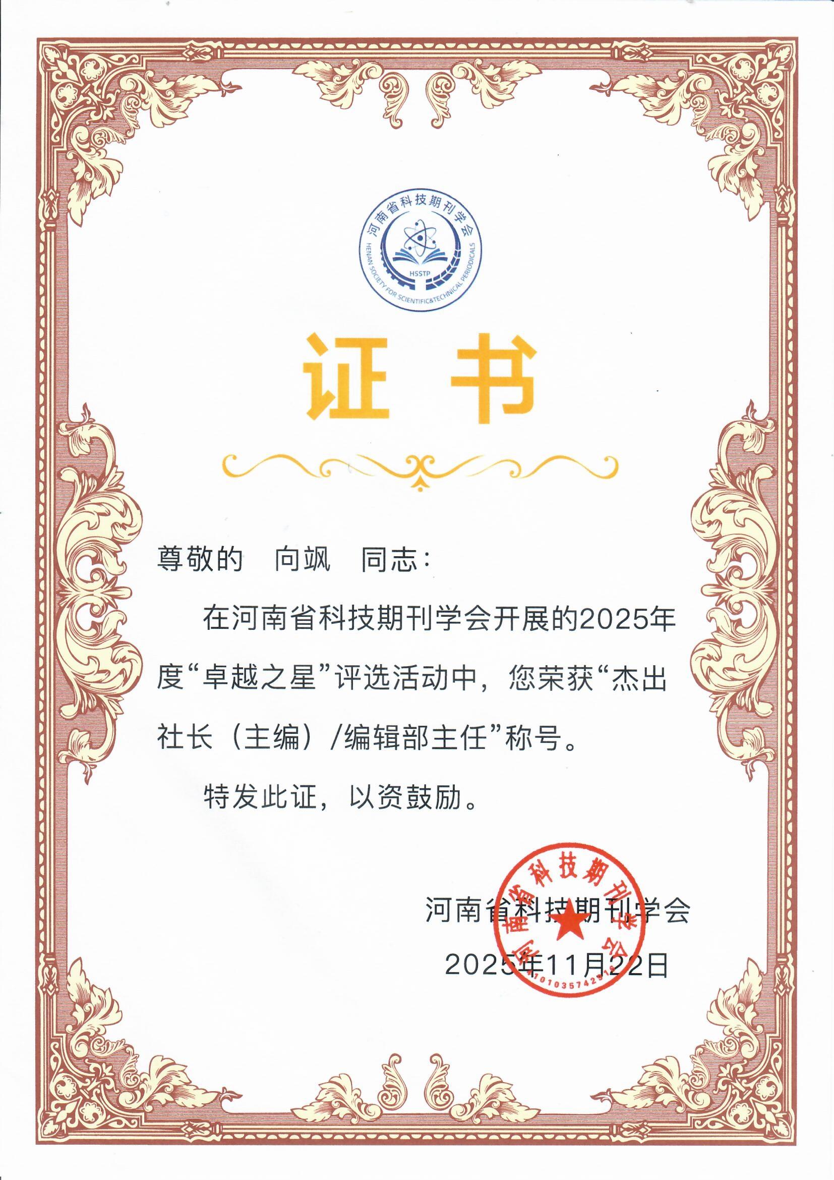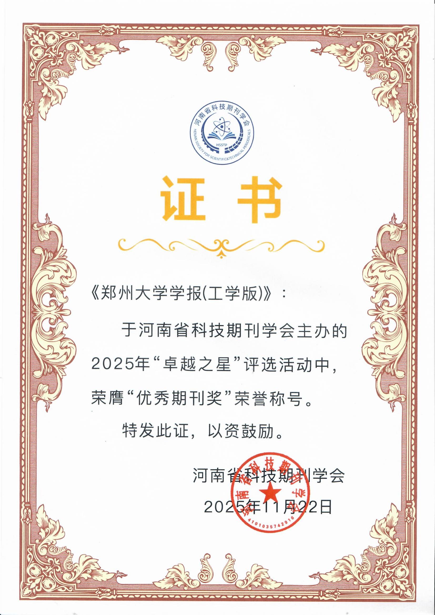 近日,河南省科技期刊学会2025年“卓越之星”评选结果正式揭晓,《郑州大学学报(工学版)》荣获2025年“卓越之星”优秀期刊奖。同时,工学版编辑部主任、执行主编向飒编审获评“杰出社长(主编)”称号。颁奖仪式在河南省科技期刊学会2025年会员大会、第二届学术研讨会暨“科创中原”会议上隆重举行。
