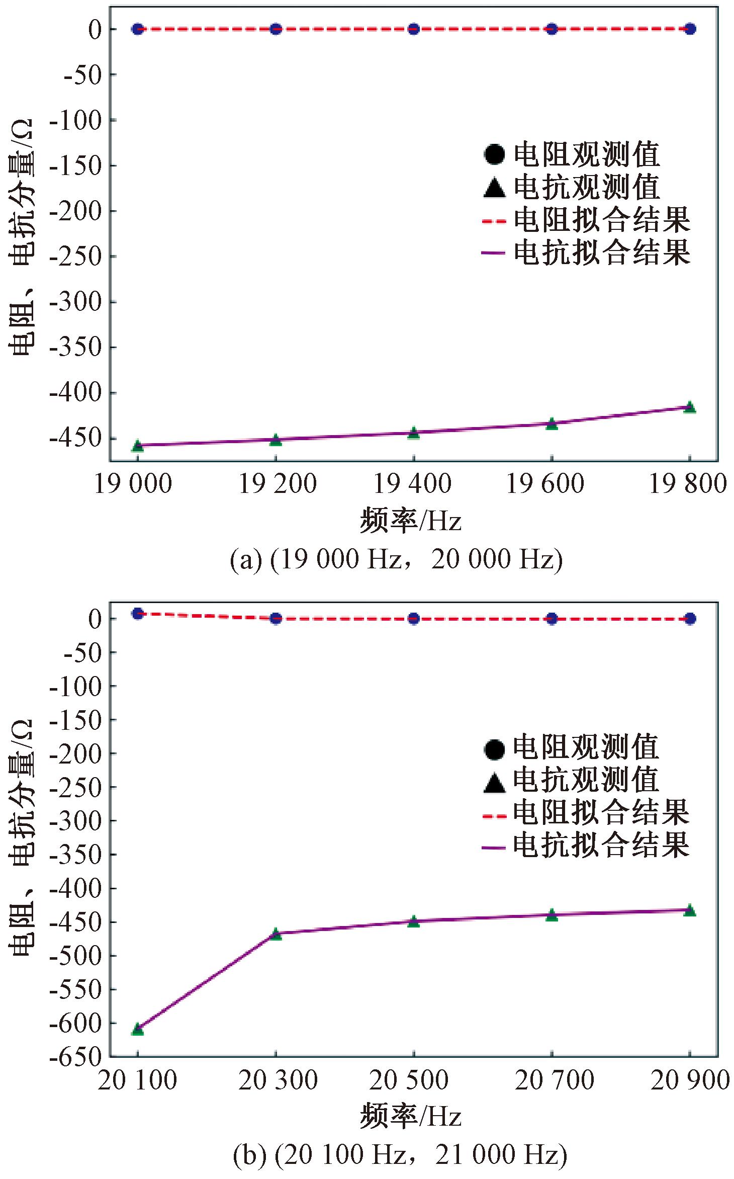 本文拟合使用的电阻、电抗分量的观测值通过式(1)、式(2)计算得到,并加入高斯噪声模拟测量误差。由于电阻、电抗分量在串联谐振频率周围呈现接近垂直的趋势[19],而最小二乘法在拟合接近垂直数据时拟合效果不佳。因此本文选择串联谐振频率±50 Hz为分界点,设置了两个频率区间,分别为(19 000 Hz,20 000 Hz)和(20 100 Hz,21 000 Hz),每个区间内选取5个观测点,每200 Hz改变一次频率。在(19 000 Hz,20 000 Hz)上参数拟合的结果如图8(a)所示,在(20 100 Hz,21 000 Hz)上的参数拟合结果如图8(b)所示。各区间内拟合得到的换能器等效电路参数与拟合优度R2如表3所示。