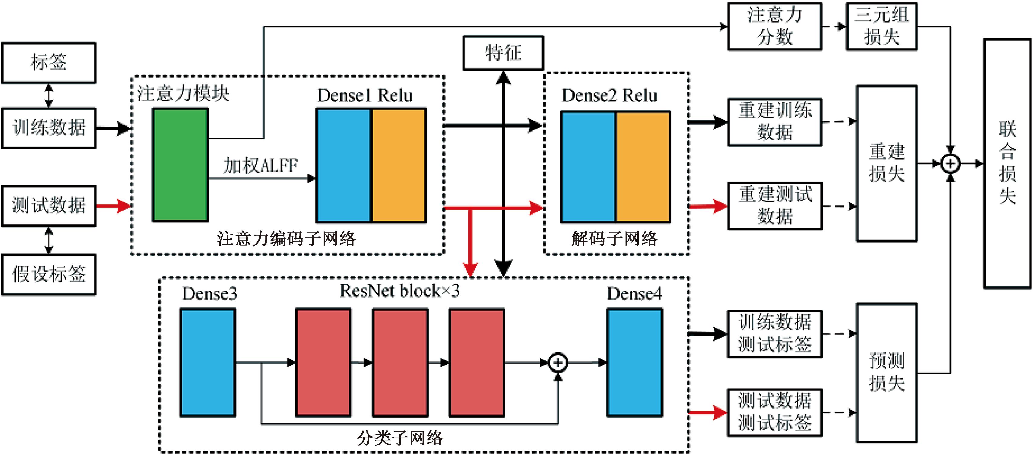 特征提取网络结构由注意力编码子网络、解码子网络和分类子网络构成,如图2所示。ALFF数据送入网络之后,首先通过注意力模块来获得权重,随后加权ALFF被用于特征提取。提取到的特征被送入解码子网络和分类子网络,送入解码子网络的特征用于ALFF数据的重建,产生重建损失对所提取的特征进行优化;送入分类子网络的特征用于测试数据的标签预测,产生预测损失对所提取的特征进行优化。特征提取阶段由三重损失函数联合进行监督优化。经过三重优化后,训练数据的特征