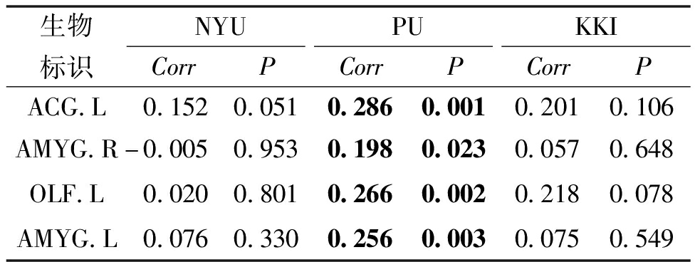 生物标识NYUPUKKICorrPCorrPCorrPACG.L0.1520.0510.2860.0010.2010.106AMYG.R-0.0050.9530.1980.0230.0570.648OLF.L0.0200.8010.2660.0020.2180.078AMYG.L0.0760.3300.2560.0030.0750.549