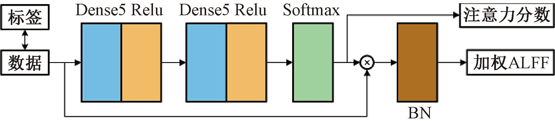 在注意力编码子网络设置了一个注意力模块。该注意力模块不仅能使网络重点关注ALFF中分类贡献高的数据,而且有助于完成后续ALFF数据的ADHD生物标识检测任务。该注意力模块结构如图3所示,由全连接层(Dense)、Relu激活层和Softmax激活层组成。其输入是24×N的ALFF数据,经过训练后产生24×N的注意力分数,并作用于ALFF数据,最后经过批处理归一化(BN)层,形成加权ALFF数据作为注意力模块的最终输出。