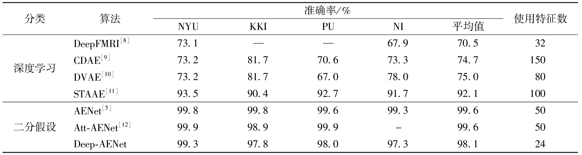 分类算法准确率/%NYUKKIPUNI平均值使用特征数深度学习DeepFMRI[8]73.1——67.970.532CDAE[9]73.281.770.673.374.7150DVAE[10]73.281.767.078.075.080STAAE[11]93.590.492.791.792.1100二分假设AENet[5]99.899.899.699.399.650Att-AENet[12]99.998.999.9-99.650Deep-AENet99.397.898.097.398.124