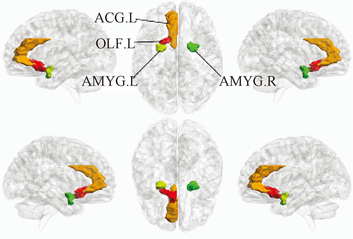 前扣带与旁扣带脑回(anterior cingulate and paracingulate gyri,ACG.L)、右杏仁核(amygdala,AMYG.R)、嗅皮质(olfactory cortex,OLF.L)和左杏仁核(amygdala,AMYG.L)是经过生物标识评估得出的典型脑区,因此作为ADHD 生物标识,这可以在ADHD的研究中得到佐证。上述生物标识在大脑中的位置如图5所示。