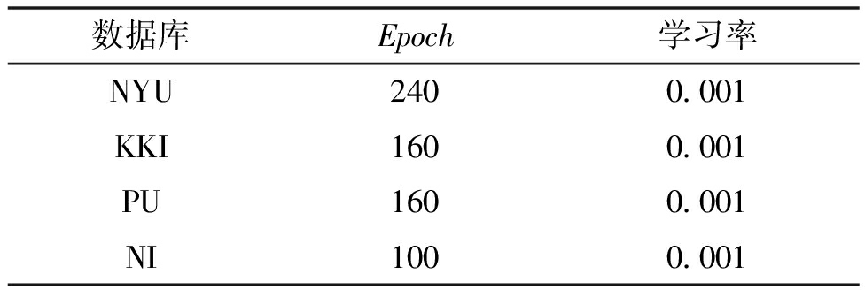 实验数据来自ADHD-200数据库[18],分别为New York University (NYU)子数据库、Kennedy Krieger Institute(KKI)子数据库、Peking University(PU)子数据库和NeuroIMAGE(NI)子数据库。这些子数据库的样本信息如表2所示。各数据库超参数设置如表3所示,所有子数据库优化器均使用Adam优化器。