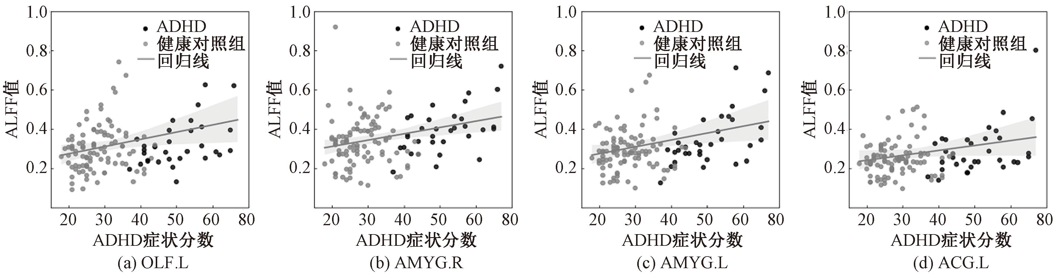 对于上述生物标识,本文进行了线性分析,结果如表6所示。分析过程使用归一化后的ALFF值和症状分数(来自ADHD-200数据库中的表型文件)来进行。另外,根据表型文件排除了共病受试者的数据,以减少其他疾病对相关性结果的影响。由表6可知,PU数据库上在置信区间设置为95%的情况下,相关性值基本都高于0.2,4个生物标识与症状分数均有着明显的相关性,这进一步表明了所得生物标识的正确性。PU数据库上ALFF值与ADHD症状分数的关系,如图6所示。