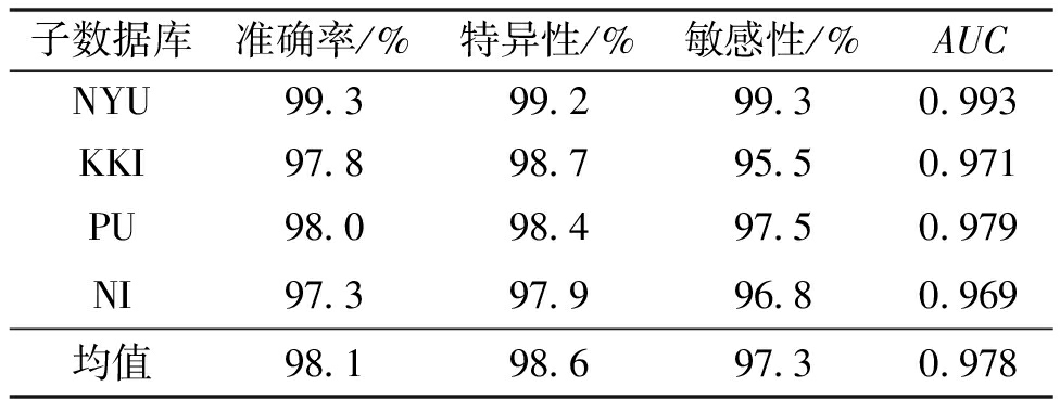 由表4可知,Deep-AENet在各数据库上均取得较好的结果,ADHD分类准确率均在97.3%以上。在NYU子数据库上比在其他3个子数据库上获得更好的表现,这是因为在深度学习中,模型的分类表现一定程度上与样本量成正比。