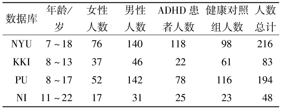 数据库年龄/岁女性人数男性人数ADHD患者人数健康对照组人数人数总计NYU7~187614011898216KKI8~133746226183PU8~175214278116194NI11~221731252348