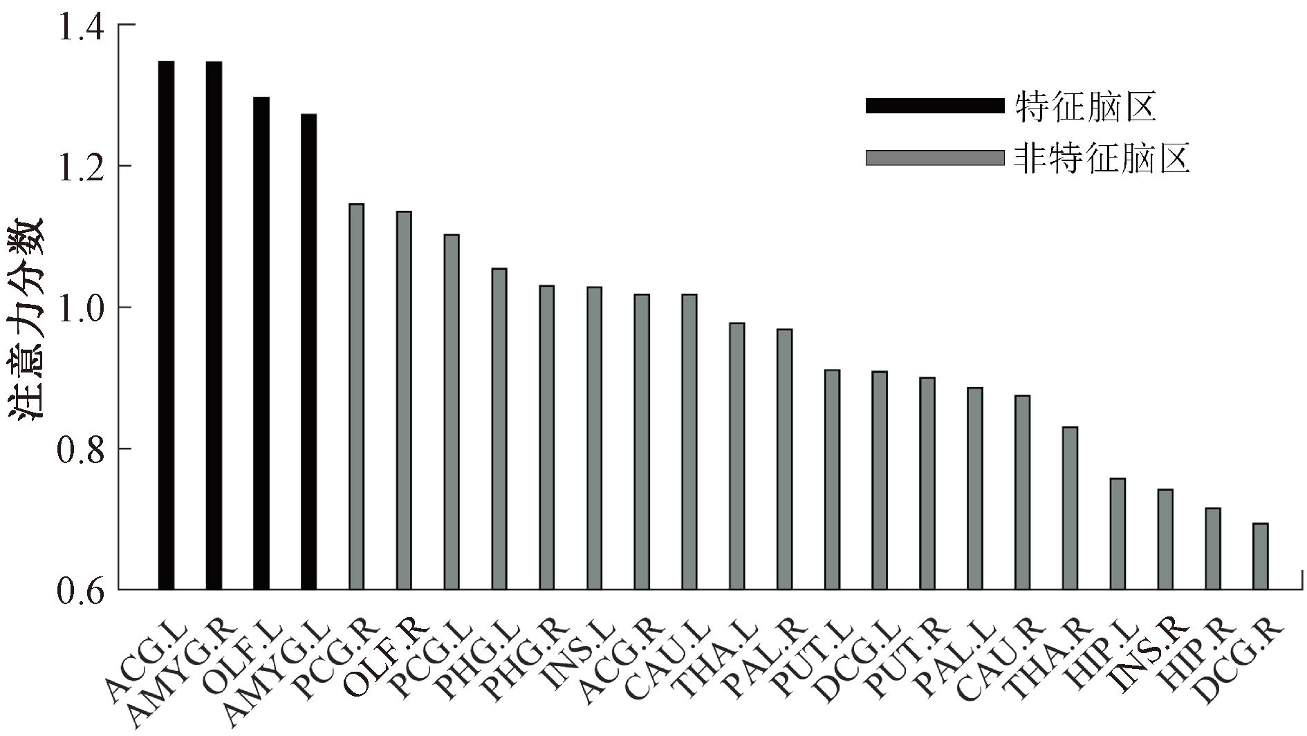 通过注意力编码子网络中的注意力分数的计算和统计进行生物标识的识别与分析。将注意力分数进行排序,边缘系统相关区域的注意力分数排序如图4所示。各子数据库的注意力分数分别在统计20次后求得均值,考虑到数据库大小和准确率的影响,最终每个脑区上的注意力分数计算公式为