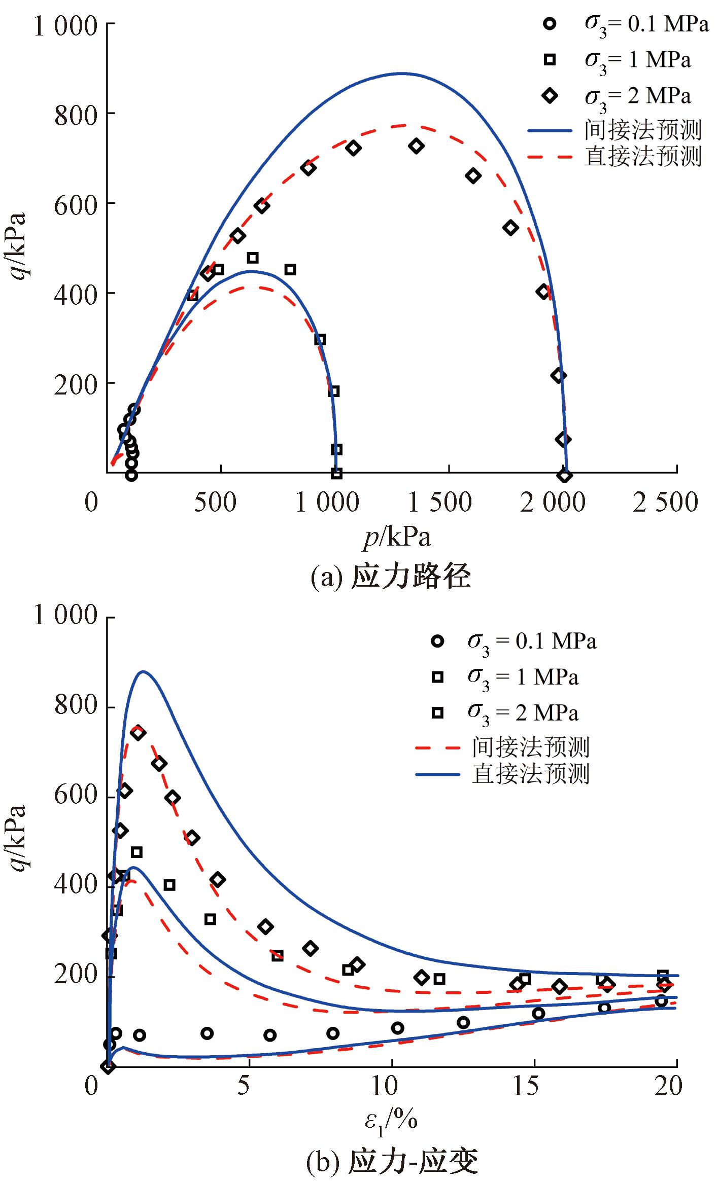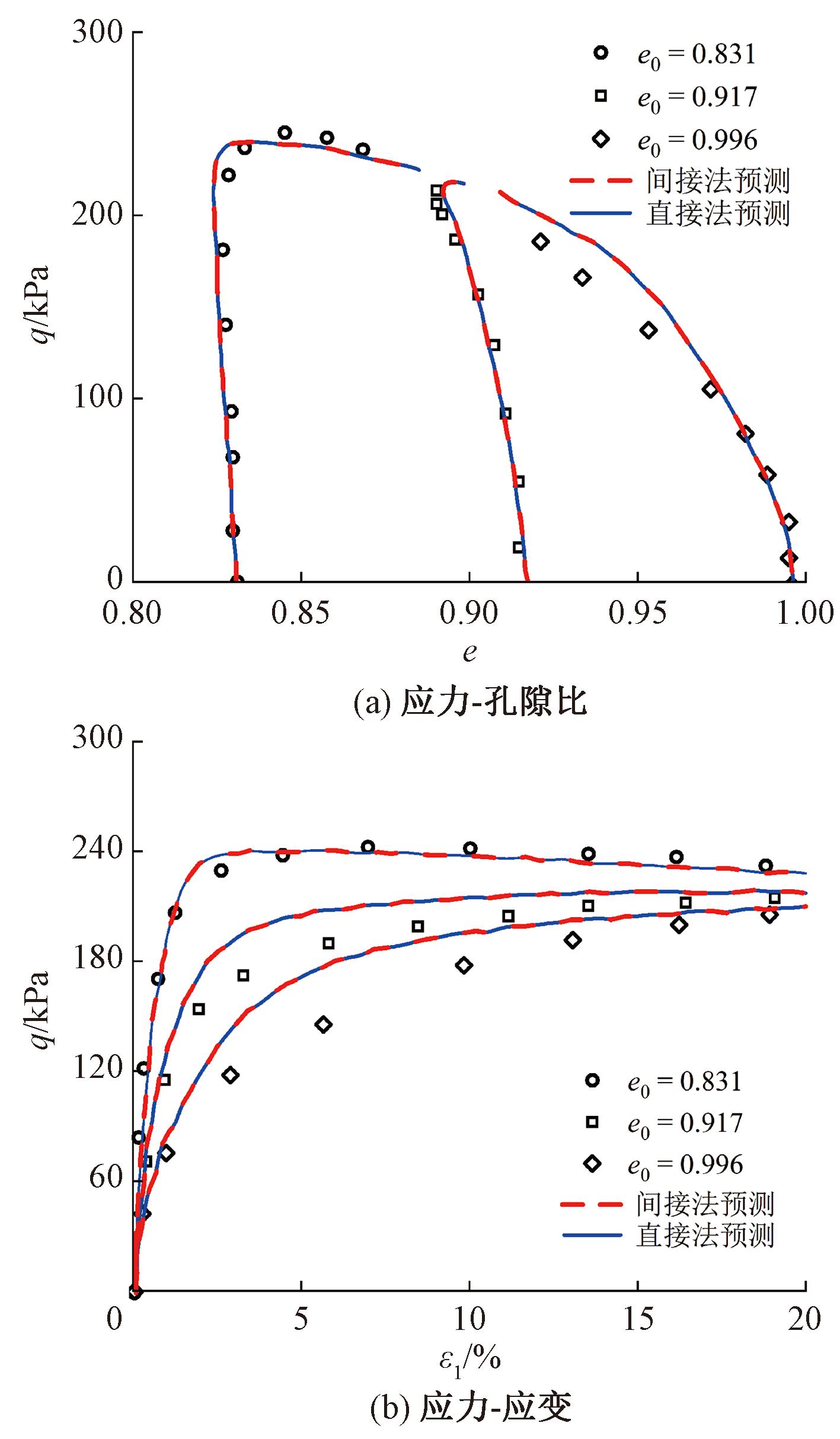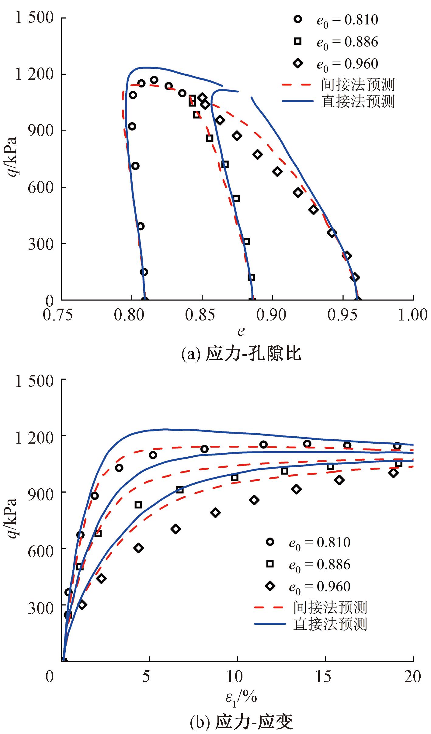 图4展示了模型对松散丰浦砂在不同初始围压下剪切行为的预测。分析可见,在低围压时,基于直接法的模型预测与基于间接法的模型预测表现相近。但随着初始围压的增加,采用直接法将高估松散砂试样在不排水剪切时的峰值强度。
