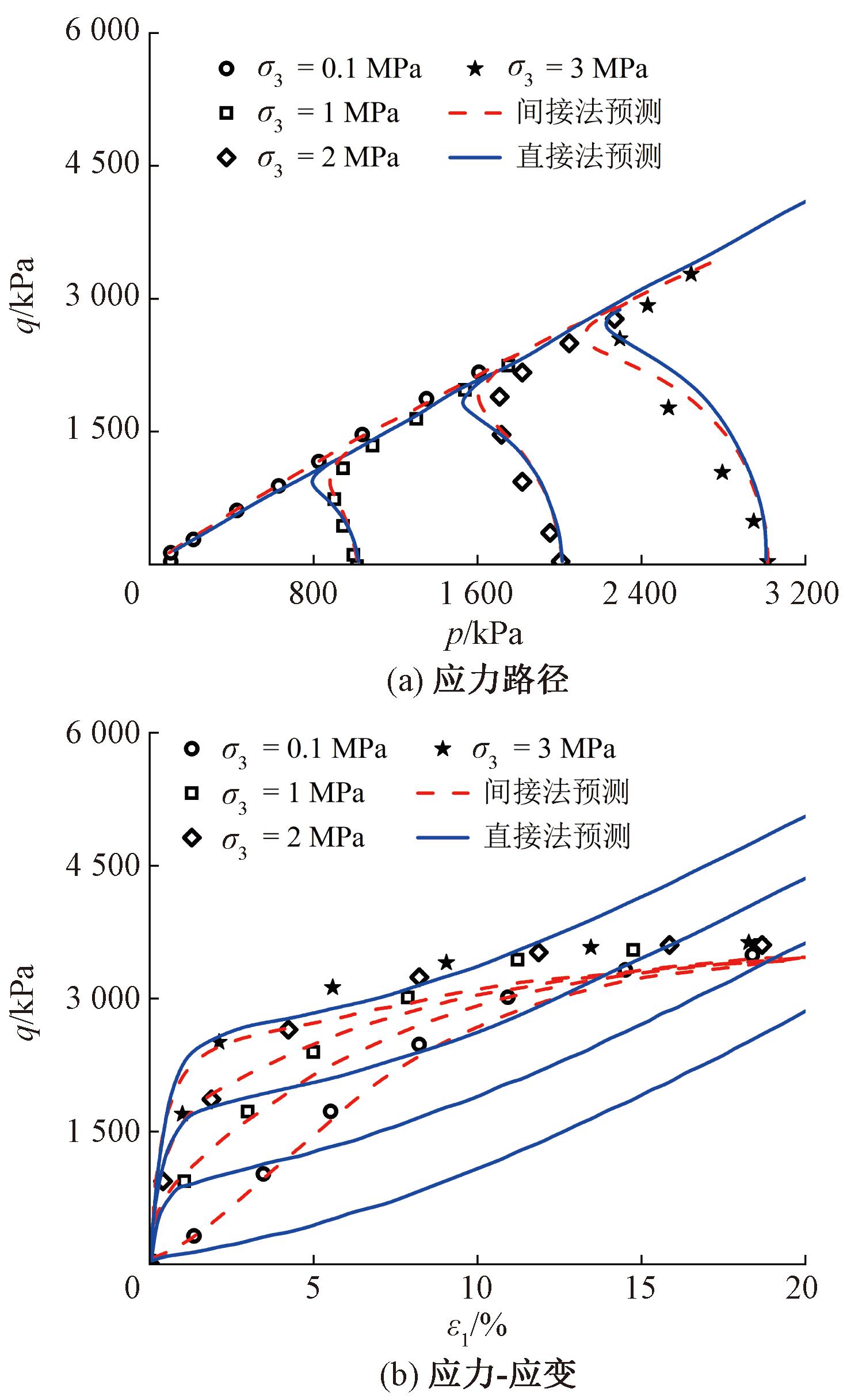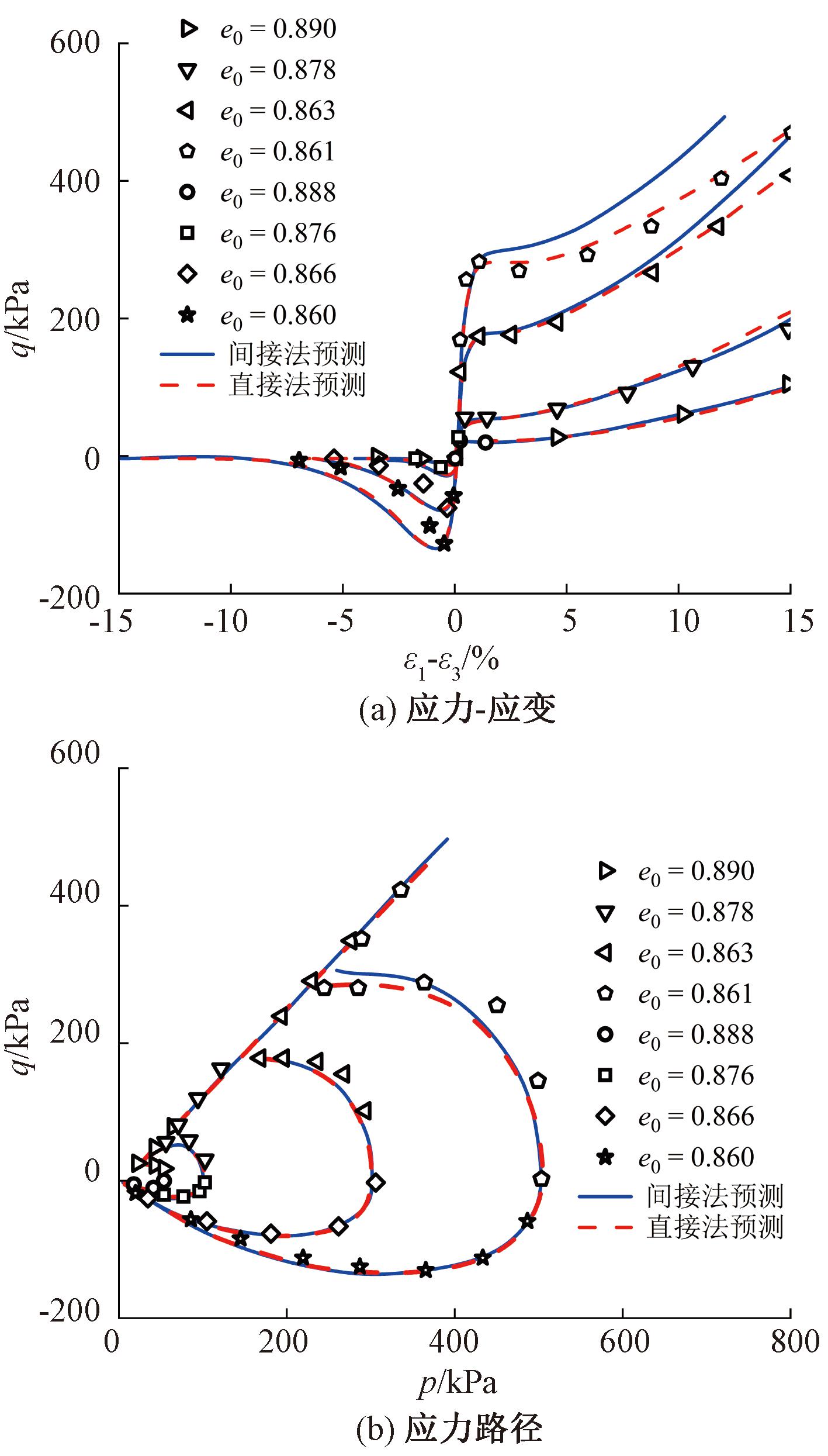 围压越高,砂土破碎程度越高是定论。图3为不同初始条件下致密丰浦砂的不排水试验模拟。分析图3可知,基于直接法和间接法的模型均可以在一定程度上刻画致密丰浦砂的不排水应力路径,但是基于间接法的模型预测更接近真实试验结果。基于直接法的模型预测无法刻画致密丰浦砂的剪切应力应变行为,加载初始,模型低估了砂土剪切应力;加载后期模型高估了砂土剪切应力。相比之下,基于间接法的模型预测可以较好地贴合试验数据。