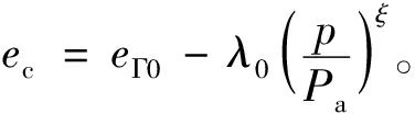 间接考虑颗粒破碎的临界状态线将e-ln p空间的临界状态数据在其他尺度空间再归纳。正如Li等[12]所指出,原本在e-ln p空间中下弯的丰浦砂临界状态线,在e-pξ空间中将重新变为直线,可以采用以下方程表达: