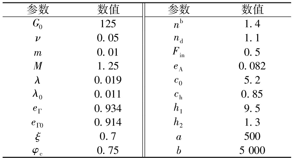 参数数值参数数值G0125nb1.4ν0.05nd1.1m0.01Fin0.5M1.25eA0.082λ0.019c05.2λ00.011ch0.85eΓ0.934h19.5eΓ00.914h21.3ξ0.7a500φc0.75b5000