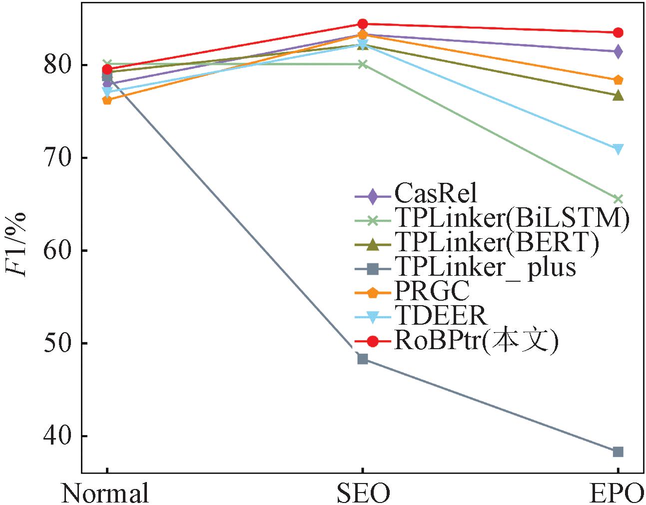 为评估模型在不同重叠模式下的性能,对包含不同重叠模式的句子展开实验,分析模型在不同模式下的性能表现。实验结果如表7所示,不同重叠模式下三元组抽取的F1如图12所示。表7的实验结果表明,在SEO和EPO模式下,RoBPtr模型的性能均优于其他基线模型,精确率分别为84.79%和83.13%,召回率分别为84.02%和83.89%,F1值分别为84.44%和83.51%。由图12可以看出,RoBPtr模型在处理包含重叠三元组的句子时,F1值相比所有基线模型都有显著提高,证明RoBPtr模型在实体关系联合抽取任务中,能够高效地识别并正确处理包含重叠现象的三元组。