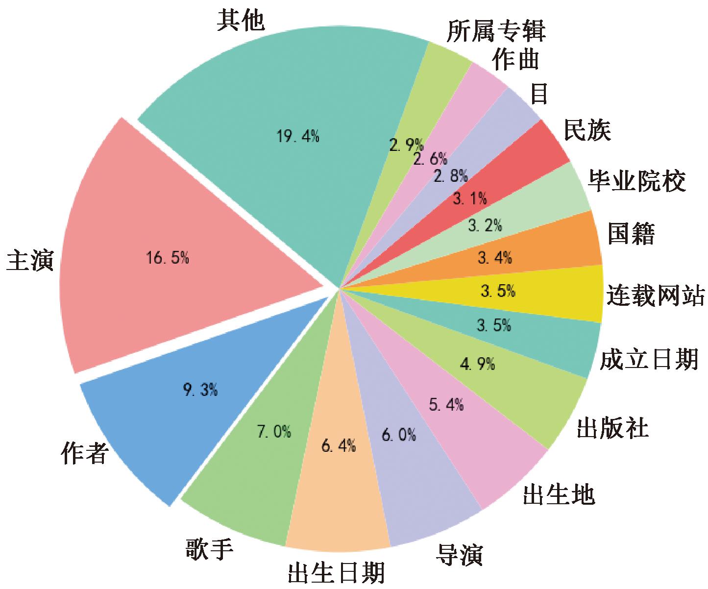 本文使用DuIE数据集[20],该数据集是当前中文信息抽取领域内依据Schema构建的最大规模的公开可用数据集。数据集中包含50种常见关系类型,例如作曲、目和民族等。图7展示了前15种占比最高的关系类型分布情况。
