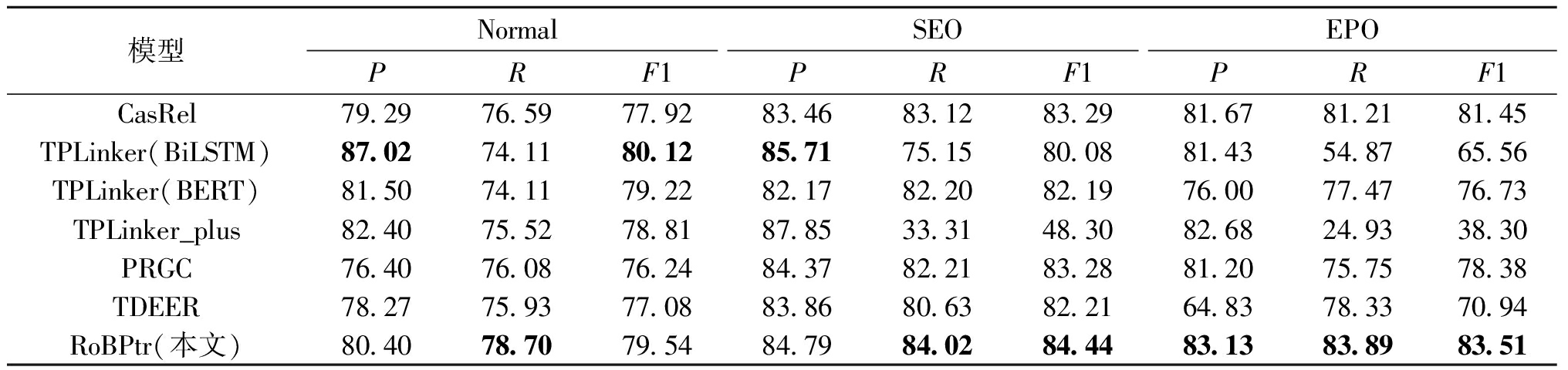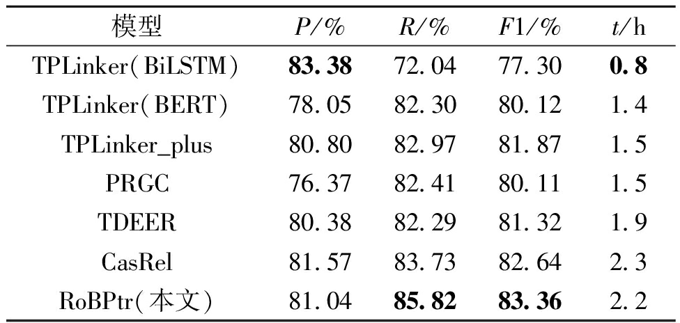 模型P/%R/%F1/%t/hTPLinker(BiLSTM)83.3872.0477.300.8TPLinker(BERT)78.0582.3080.121.4TPLinker_plus80.8082.9781.871.5PRGC76.3782.4180.111.5TDEER80.3882.2981.321.9CasRel81.5783.7382.642.3RoBPtr(本文)81.0485.8283.362.2