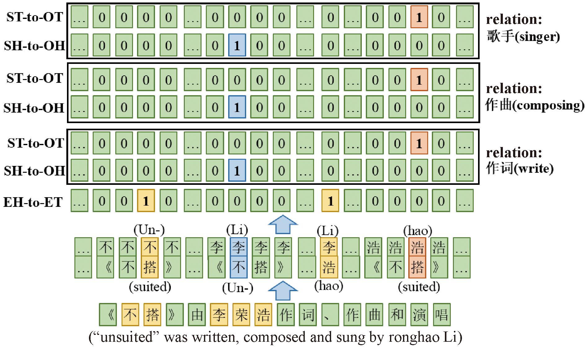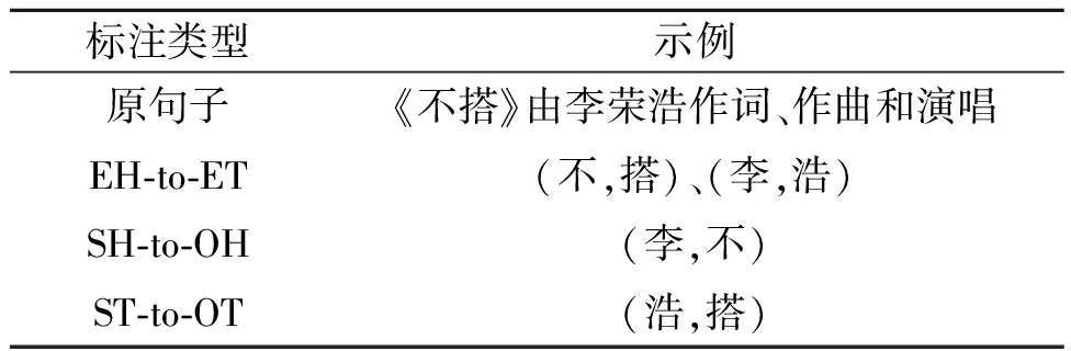 标注类型示例原句子《不搭》由李荣浩作词、作曲和演唱EH-to-ET(不,搭)、(李,浩)SH-to-OH(李,不)ST-to-OT(浩,搭)