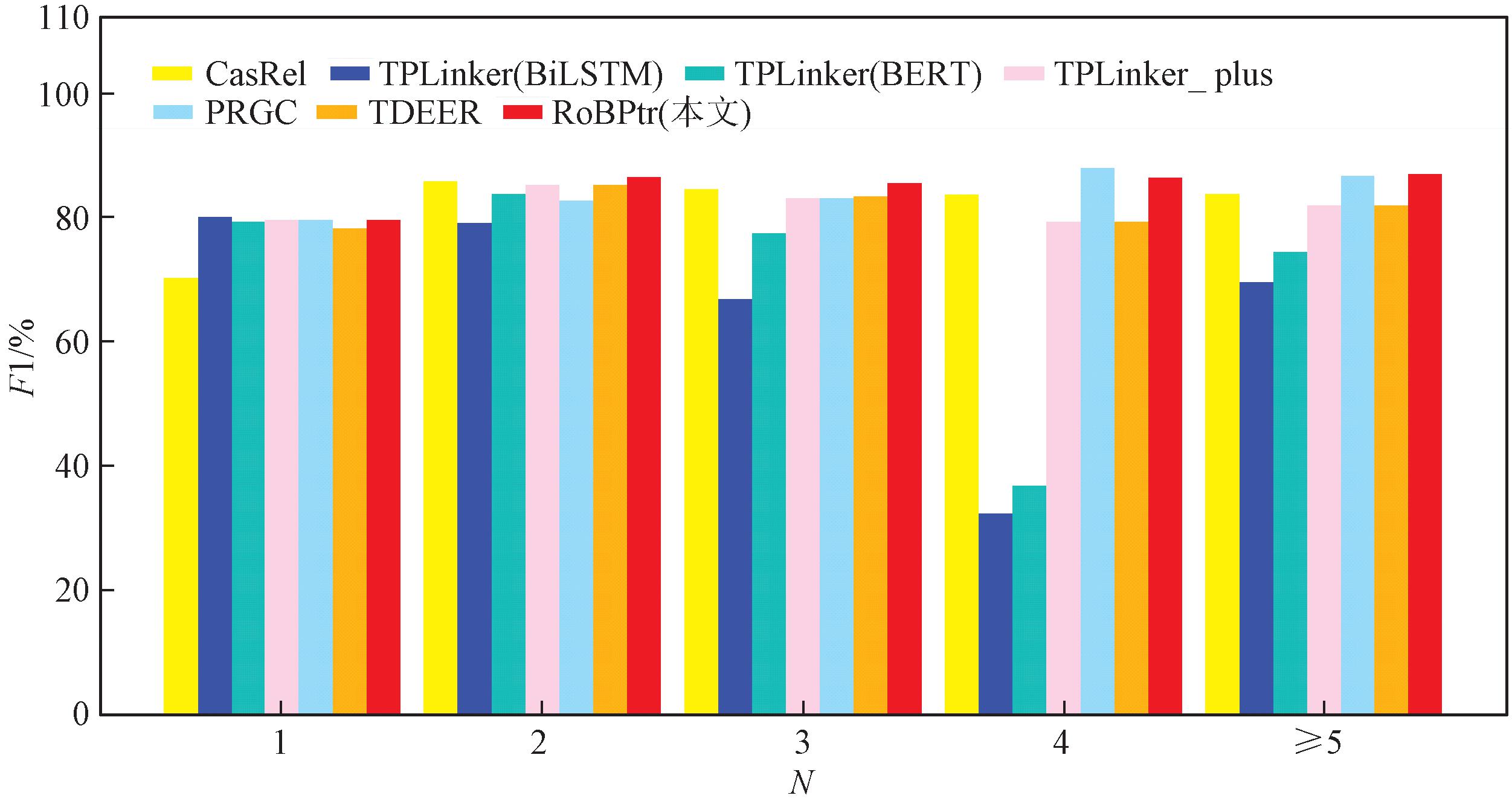 为评估模型在处理复杂句子方面的性能,对包含不同数量三元组的句子进行实验,以分析模型从不同复杂度句子中抽取三元组的能力。通常,句子中三元组数量越多,其复杂度越高。实验结果如表6所示。实验结果表明,在处理具有不同数量三元组(N=1,2,3,4和N≥5)的语句时,RoBPtr模型的性能超过了所有对比基准模型,F1值分别为80.41%、86.70%、85.63%、86.43和87.12%。针对不同复杂度级别的比较(N=1~5),RoBPtr模型展现了其优越性:当N=1时,与TPLinker(BiLSTM)相比,RoBPtr的F1值提高0.31百分点;对于N=2和N=3的情形,RoBPtr相对于CasRel,F1值分别提高了0.78百分点和1.06百分点;而对于N=4情形,RoBPtr的性能表现略逊于表现最佳的PRGC模型;但当N≥5时,与PRGC模型相比,RoBPtr的F1值提升了0.35百分点。同时,实验结果表明,在文中存在多个三元组时,RoBPtr模型性能表现最优,并随着三元组个数的增加呈上升趋势,具体变化趋势参考图11。由图11可知,RoBPtr模型能有效处理复杂句子,并在复杂场景下的实体与关系联合抽取任务中优于基线模型。