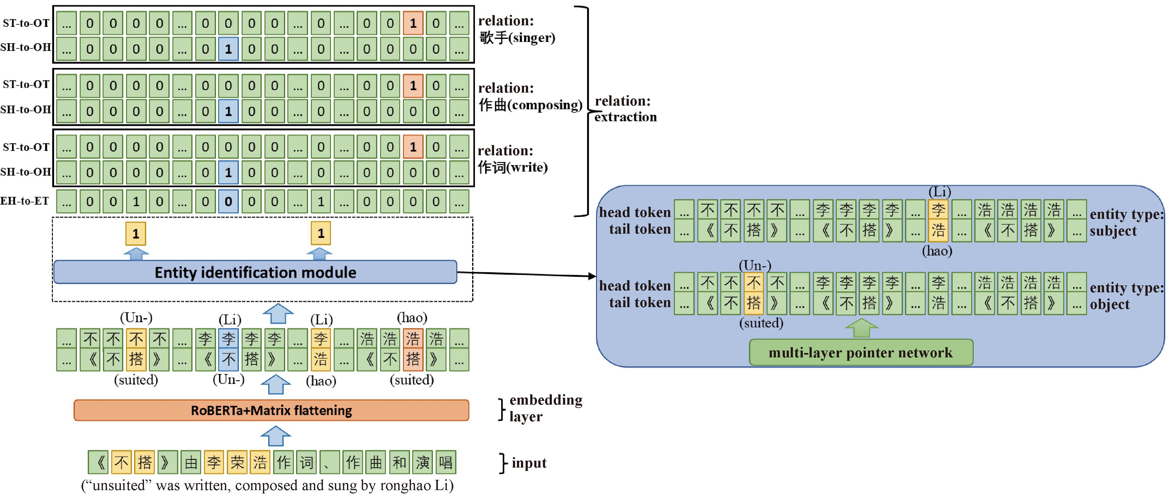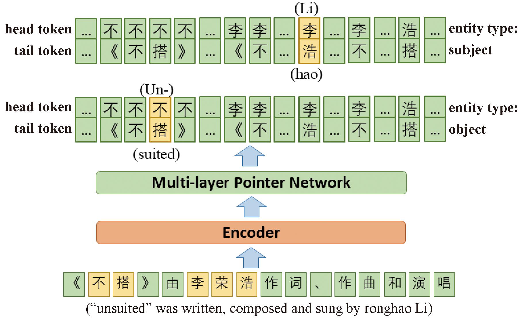 (2)借助指针网络将实体识别任务转化为识别token-pair的问题,通过确定实体的起始与终止位置,提取所有潜在实体。