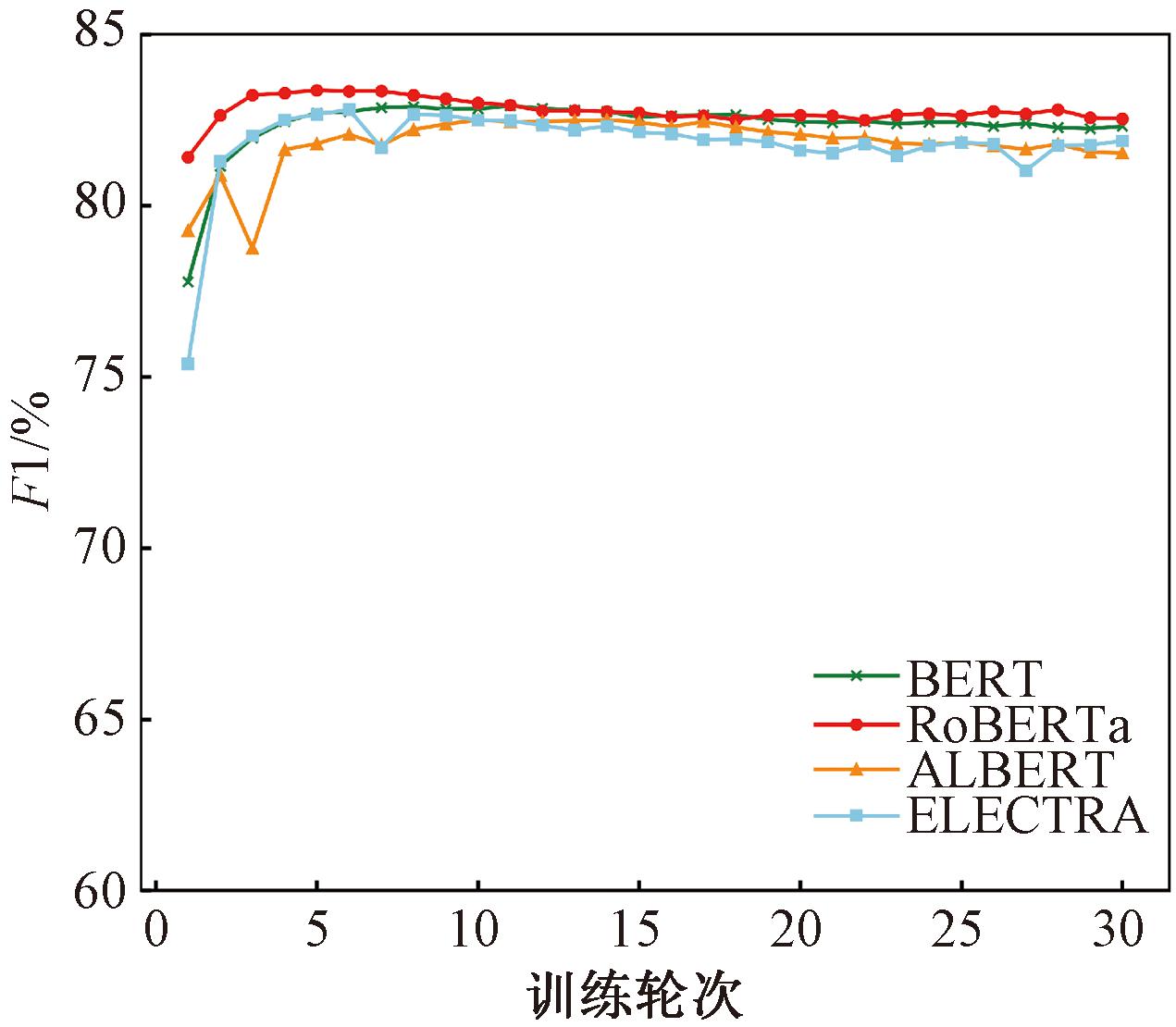图9 联合抽取模型使用不同语言模型作为编码器在F1值曲线的性能对比