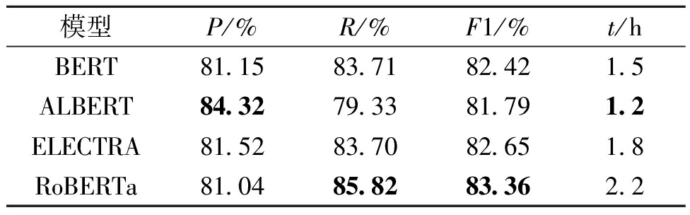 模型P/%R/%F1/%t/hBERT81.1583.7182.421.5ALBERT84.3279.3381.791.2ELECTRA81.5283.7082.651.8RoBERTa81.0485.8283.362.2