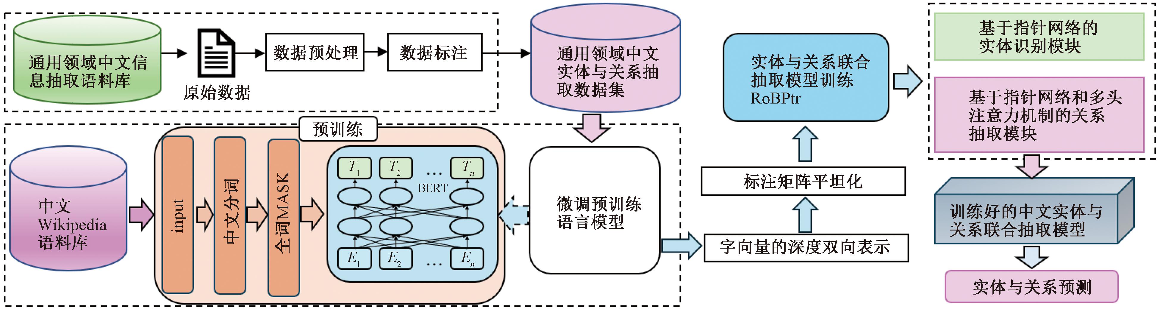 本文提出一种基于RoBERTa和指针网络的中文实体与关系联合抽取方法,将实体与关系联合抽取任务构建为token-pair识别问题,即把三元组(s, r, o)抽取任务重构为五元组(sh, st, r, oh, ot)识别任务。该方法主要分为通用领域中文实体与关系抽取数据集构建模块、预训练模块和下游实体与关系联合抽取模型训练3个部分,本文方法流程如图1所示。