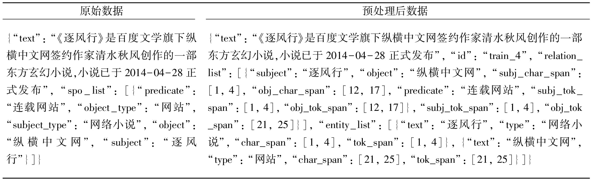 对DuIE数据集进行预处理操作,将原始语料转化为以文本、实体列表和三元组列表形式的数据结构,同时以token-pair形式标注实体的开始和结束位置,DuIE数据示例如表3所示。