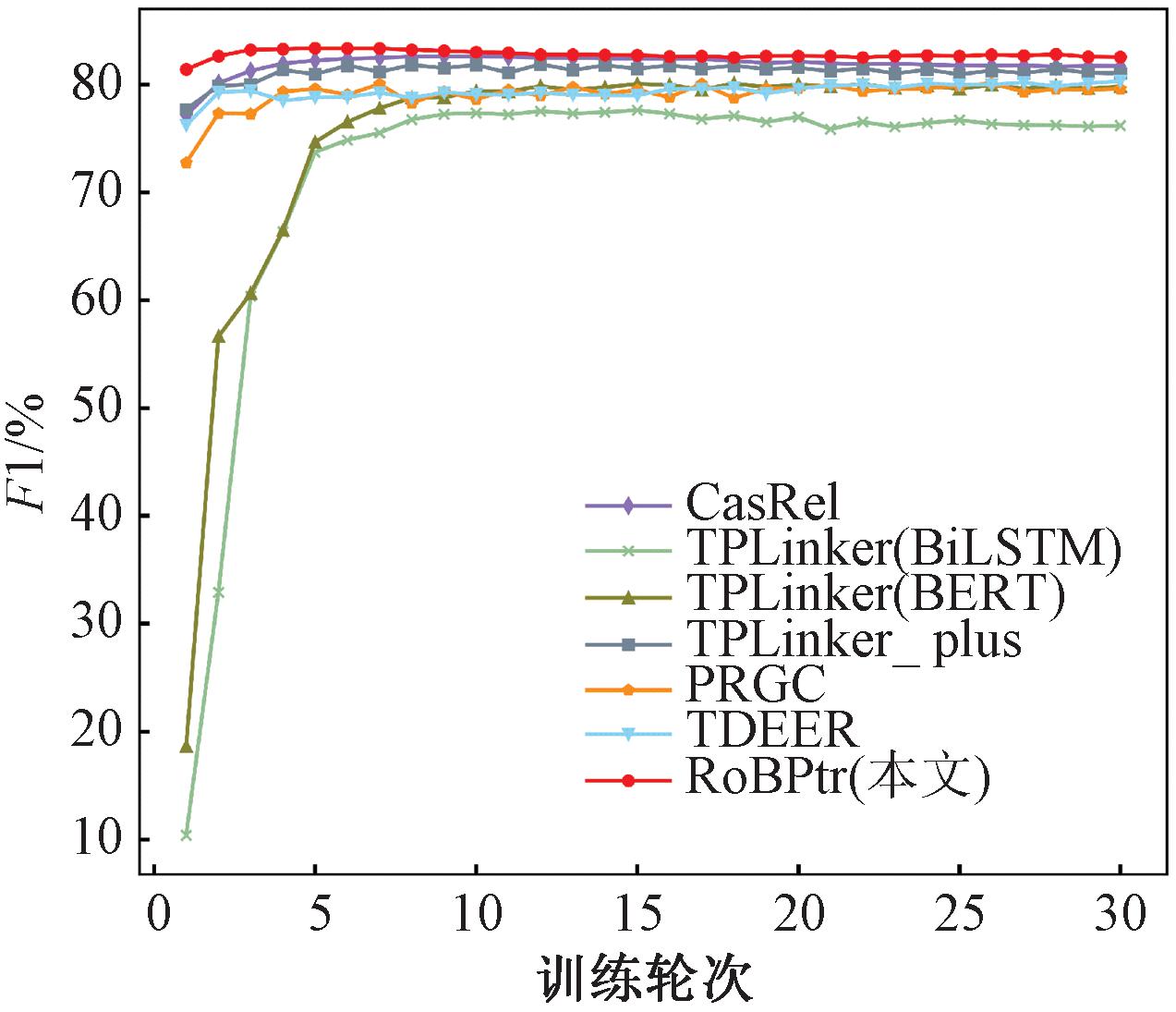 为了评估RoBPtr模型在实体关系联合抽取任务上的性能表现,挑选5个经典模型(TPLinker[8]、TPLinker_plus[8]、PRGC[10]、TDEER[11]和CasRel[7])为基线进行比较,对比实验结果如表5所示。实验结果显示,与所有基线模型相比,RoBPtr模型在DuIE数据集上的表现较佳,其精确率、召回率及F1值分别为81.04%、85.82%和83.36%。在对比的基准模型中,CasRel的F1值达到82.64%,但其两阶段抽取方法在训练过程中容易受到信息错误传播的影响。TDEER模型引入负样本以减少错误累积,但仍未能完全消除阶段间的信息暴露偏差和错误传播问题,模型的精确度、召回率和F1值分别为80.38%、82.29%和81.32%。RoBPtr模型通过联合建模有效解决信息错误传播和暴露偏差等问题,性能表现优于CasRel和TDEER模型。相较于专门为处理复杂句式和三元组重叠问题而设计的TPLinker(BERT)、TPLinker_plus、PRGC及TDEER模型,RoBPtr展现出极具竞争力的性能,相较于上述4个基线模型,RoBPtr模型F1值分别提升了3.24百分点、1.49百分点、3.25百分点和2.04百分点。图10展示了各模型在整个训练过程中F1变化趋势。