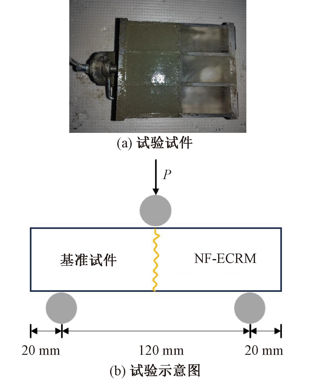 (4)将粘结试件放入标准养护室养护28 d后测试粘结试件的界面弯拉强度,试验试件及试验示意图如图2所示。结果取6个界面弯拉强度测试值的平均值。