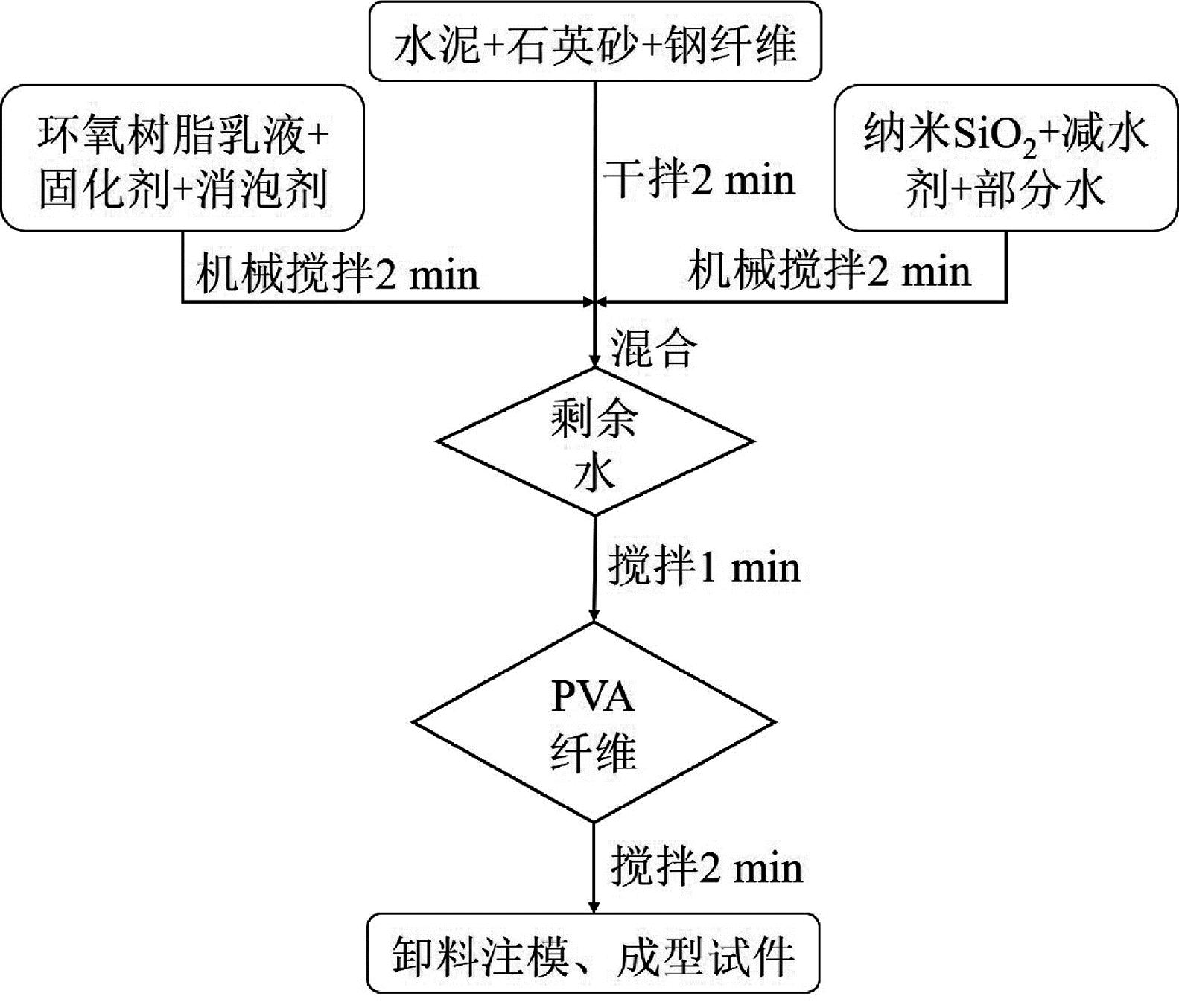 环氧树脂是常用的有机类混凝土修复材料,能在水环境和高碱度环境中固化。环氧树脂经固化剂的催化作用后,可在水泥基质中形成具有三维网络拓扑的薄膜结构。该聚合物网络通过界面键合作用与水化硅酸钙凝胶形成互穿结构,能够有效填充毛细孔隙,从而优化复合材料孔隙分布,显著提升体系体积稳定性及渗透阻力。此外,环氧树脂水泥基修复材料(ECRM)还具有优良的粘结性能和较好的耐候、耐磨、耐腐蚀性能,因而被广泛应用于混凝土修复。然而,环氧树脂的分子结构会阻碍水化产物的形成过程,进而影响修复材料的力学性能发展。由于纳米SiO2能够促进水泥水化,增加水化硅酸钙凝胶的生成量,因此,在ECRM中掺入纳米SiO2能够有效消除或削弱环氧树脂对水泥基材料的负面影响[2-3]。针对开裂混凝土的修复,若修复材料能够提供较好的韧性和抗裂能力,则可以最大程度地避免混凝土的二次开裂,从而提升修复效果[4]。目前常用的提高水泥基材料韧性和抗裂能力的措施是向水泥基材料中掺加纤维[5]。钢纤维的高弹性模量和抗拉强度特性能显著提升混凝土的强度和韧性。但是密度大、成本高的特性也会增加混凝土的自重和造价。聚乙烯醇(PVA)纤维自重轻、成本低、尺寸较小的特性能降低混凝土的自重和造价,减少早期塑性收缩产生的裂缝数量,但是对混凝土强度的提升效果不明显。钢-PVA混杂纤维能够实现分级抑制微裂纹萌生、扩展及贯通等破坏过程,在保证结构性能的同时具有较好的经济效益。因此,纳米SiO2和钢-PVA混杂纤维混合掺入到环氧树脂水泥基修复材料中能最大限度地发挥其修复效果。