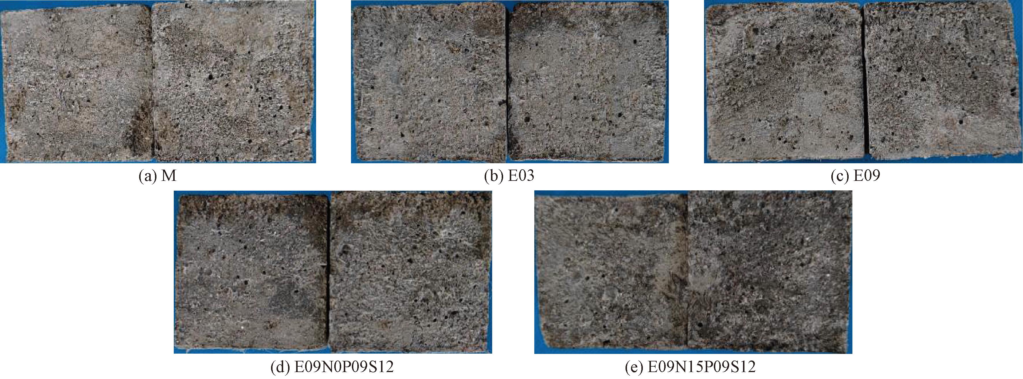 图3(a)~3(c)展示了基准组和ECRM试件破坏后的粘结界面形态。当施加荷载达到峰值时,试件会突然破坏并断成两部分,且破坏位置均在粘结界面处,试件破坏过程中表现出明显的脆性破坏特征。对比试件的破坏界面可以观察到,基准组试件的破坏界面相对光滑,界面表面仅存在少量浮浆。掺加环氧树脂后,试件界面处存在的修复材料增多,粘结界面的破损也更加明显。图3(d)和图3(e)展示了NF-ECRM试件破坏后的粘结界面形态。在试验加载初期试件表面无明显裂缝。随着荷载的增加,试件侧面粘结界面处首先出现微裂缝,随后裂缝沿着粘结界面慢慢扩展,直至试件断开。破坏试件的粘结表面均分布有少量的PVA纤维和钢纤维。此外,随着纳米SiO2或混杂纤维掺量的增加,粘结界面的粗糙度均逐渐增大。
