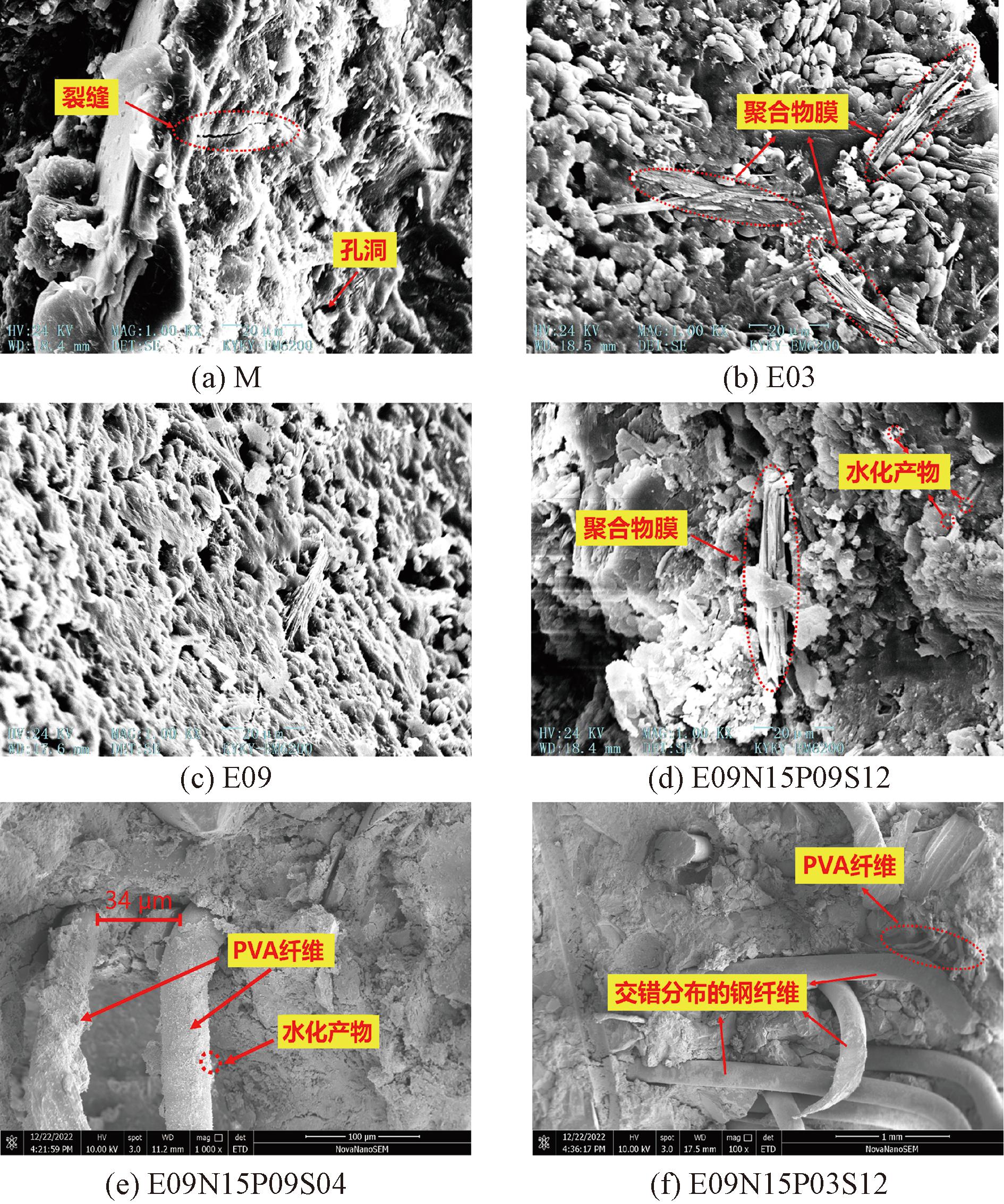 基于以上宏观性能的分析结果可知,环氧树脂、纳米SiO2和混杂纤维的掺入对NF-ECRM粘结性能的提升是有利的。为进一步从微观形貌层面揭示性能的增强机理,本文开展了SEM微观试验,试验结果如图8所示。图8(a)展示了基准组试件基体表面的微观形貌,具体表现为基体表面整体结构松散,水化产物较少,孔洞缺陷较多,能明显观察到几条长裂缝。基准组试件基体内部较多的缺陷和松散结构使得其粘结界面的性能较差[17]。掺加环氧树脂后,水泥基修复材料的基体内部能观察到大量的聚合物膜,如图8(b)所示。覆盖在基体表面的聚合物膜能够一定程度上抑制微裂纹的产生和扩展。另一方面,起填充作用的环氧树脂颗粒能够黏附基体内的水化产物,从而减小基体的孔洞数量及尺寸。随着环氧树脂掺量的增加,聚合物膜覆盖的区域逐渐增多,从而显著提升了基体致密性和整体性,如图8(c)所示。由于纳米SiO2的火山灰特性,图8(d)中能观察到较多的水化产物,基体表面的孔洞缺陷显著减少,基体结构的致密性较好。纤维和纳米SiO2在基体内部的分散程度影响着增强材料对水泥基修复材料粘结特性的增强效果:当纤维掺量较少,纳米SiO2的掺量较多时,纤维之间的间距较大,纤维表面的凝胶含量较多,如图8(e)所示。保持纳米SiO2的掺量不变,随着纤维掺量的增加,纤维之间的间距减小,各纤维在基体内部交错分布,有效抑制了裂缝的产生和扩展,增加了基体的整体性。然而,纤维表面的凝胶含量显著减少,这可能与较高掺量的纤维降低了拌和物的工作性能,导致纳米SiO2的分散程度降低有关[18],如图8(f)所示。Mohammadalipour等[19]通过X射线衍射试验探究了纳米粒子、纤维和环氧树脂的掺入对复合材料界面性能的影响。研究结果表明,纳米粒子的掺入能够显著提升纤维/环氧树脂复合材料的界面剪切强度和粘结性。Hu等[20]采用计算机断层扫描试验探究了纳米SiO2和纤维复合掺入到工程水泥基复合材料中对其微观结构的影响。研究结果表明,适当掺量组合的纳米SiO2和纤维能够优化基体内的孔隙结构,充分发挥基体与纤维之间的粘结作用。综上所述,环氧树脂、纳米SiO2和纤维的掺入能够有效抑制基体内裂缝的产生和扩展,减少基体内的缺陷数量,提高结构的致密性和整体性,这是NF-ECRM粘结性能较好的主要原因。
