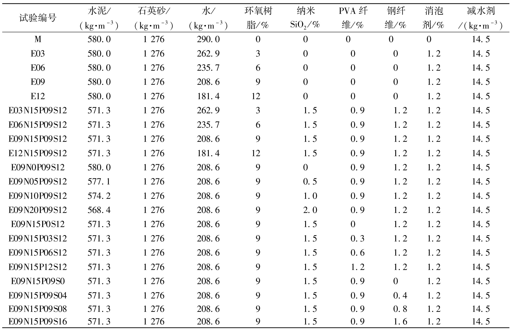 试验编号水泥/石英砂/水/环氧树纳米PVA纤钢纤消泡减水剂(kg·m-3)(kg·m-3)(kg·m-3)脂/%SiO2/%维/%维/%剂/%/(kg·m-3)M580.01276290.0000 0 0 14.5E03580.01276262.930001.214.5E06580.01276235.760001.214.5E09580.01276208.690001.214.5E12580.01276181.4120001.214.5E03N15P09S12571.31276262.931.50.91.21.214.5E06N15P09S12571.31276235.761.50.91.21.214.5E09N15P09S12571.31276208.691.50.91.21.214.5E12N15P09S12571.31276181.4121.50.91.21.214.5E09N0P09S12580.01276208.6900.91.21.214.5E09N05P09S12577.11276208.690.50.91.21.214.5E09N10P09S12574.21276208.691.00.91.21.214.5E09N20P09S12568.41276208.692.00.91.21.214.5E09N15P0S12571.31276208.691.501.21.214.5E09N15P03S12571.31276208.691.50.31.21.214.5E09N15P06S12571.31276208.691.50.61.21.214.5E09N15P12S12571.31276208.691.51.21.21.214.5E09N15P09S0571.31276208.691.50.901.214.5E09N15P09S04571.31276208.691.50.90.41.214.5E09N15P09S08571.31276208.691.50.90.81.214.5E09N15P09S16571.31276208.691.50.91.61.214.5