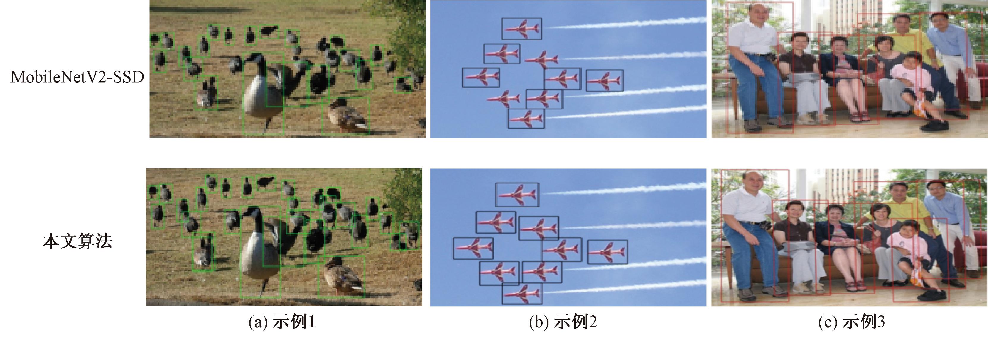 分别对SSD、MobileNetV2-SSD、SPP+MobileNetV2-SSD、FPN+MobileNetV2-SSD以及本文所提算法进行对比。5种检测算法的对比结果如表1所示,MobileNetV2-SSD与本文算法的检测效果如图6所示。