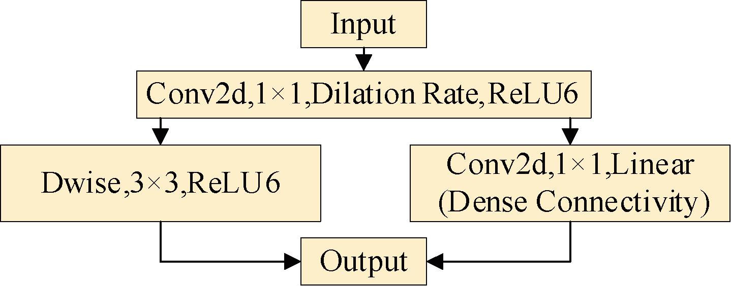 在设计网络时,尽管使用了扩张系数为1的瓶颈,但是仍然保留了原有的1×1卷积层。这是因为1×1卷积不仅能提升网络的整体性能,更重要的是,它允许对多个特征映射进行线性组合,实现跨通道特征的有效集成。值得注意的是,尽管初始的1×1卷积扩张系数设置为1,网络引入的密集连接依然能对性能提升产生积极影响。这一创新设计使得模型在不同任务中表现出色,同时保证了计算效率。本文设计的瓶颈结构如图2所示,为进一步研究提供了新的思路和方法。