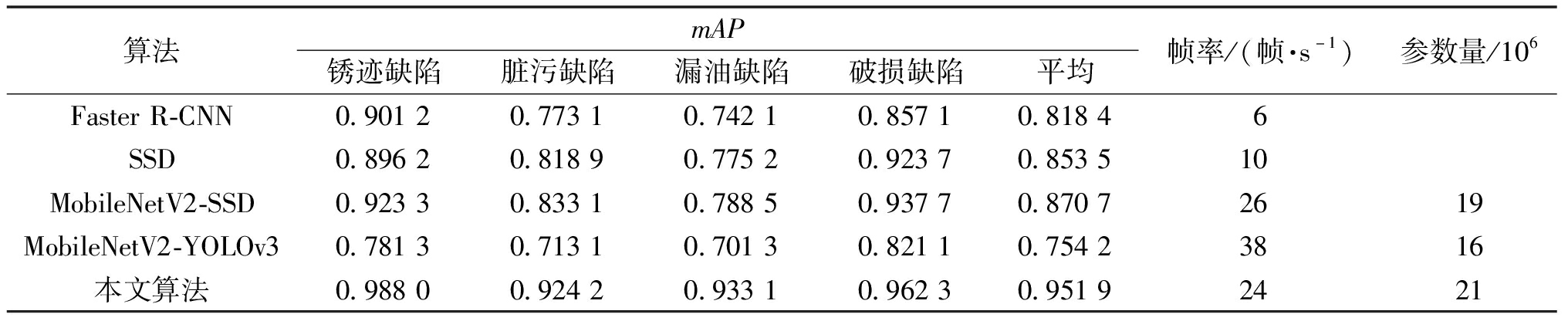 算法mAP锈迹缺陷脏污缺陷漏油缺陷破损缺陷平均帧率/(帧·s-1)参数量/106FasterR-CNN0.90120.77310.74210.85710.81846SSD0.89620.81890.77520.92370.853510MobileNetV2-SSD0.92330.83310.78850.93770.87072619MobileNetV2-YOLOv30.78130.71310.70130.82110.75423816本文算法0.98800.92420.93310.96230.95192421