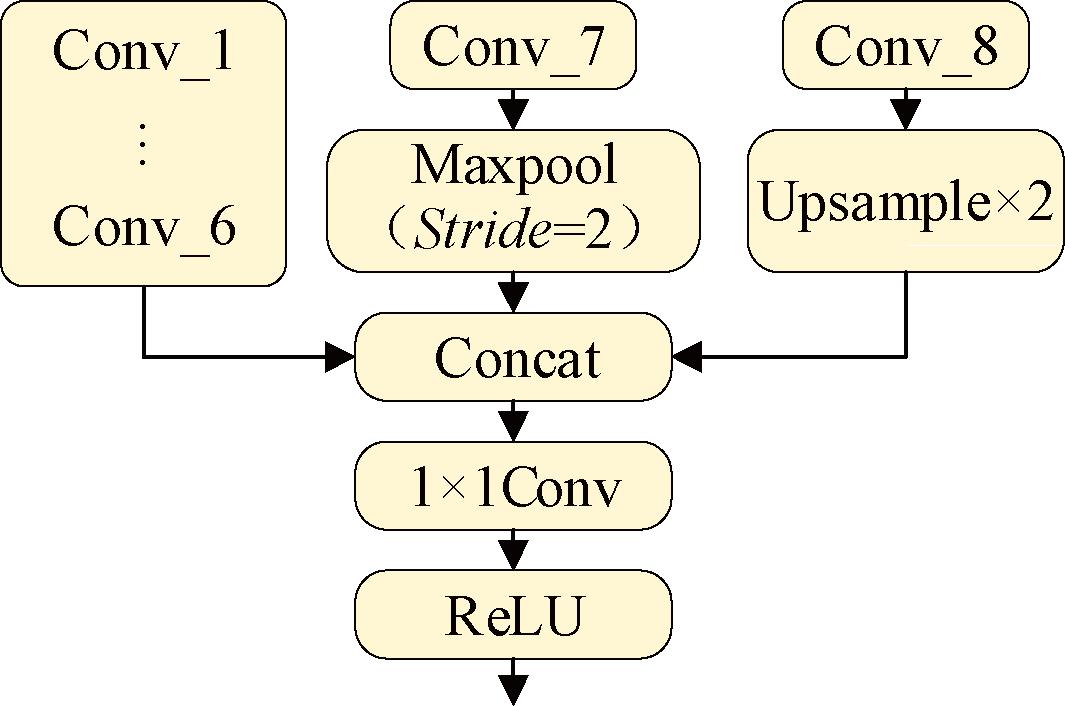 深层卷积层具备丰富语义信息利于缺陷分类,但低分辨率导致细节缺失;浅层卷积层分辨率高有助于定位,但语义不足,尤其是小尺寸缺陷定位十分困难[20]。本文基于电力器件缺陷的特点,设计了特征融合模块,将深层低分辨率强语义特征与浅层高分辨率细节特征融合,生成既高分辨率又富含语义和细节的信息图用于预测不同大小的缺陷。具体如图5所示,Conv_7和Conv_8先采用Stride=2最大池化和上采样,再与前层特征图融合,最后通过卷积降维输出。