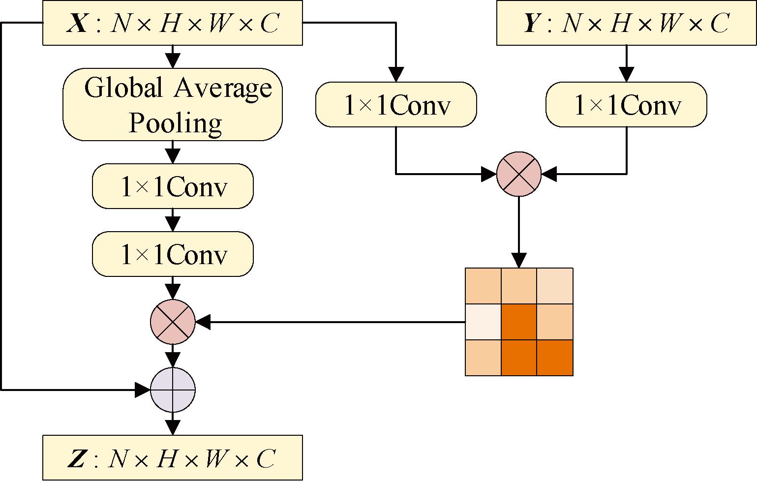 CL-IFPN以图3中的特征图X、Y为输入。首先在X前添加全局平均池化层与1×1卷积获取全局特征信息,随后对X、Y进行线性映射得到Q、K、V特征。经Reshape操作合并3个特征除通道数外的维度后,对Q和K进行矩阵点乘,计算特征的自相关性,得到每帧中每个像素与其他所有帧所有像素的关系。对自相关特征进行Softmax操作,得到值域为[0,1]的Self-Attention系数。最终将 Self-Attention系数对应乘回特征矩阵V,经1×1卷积后与原输入特征图X做残差运算,获得输出。