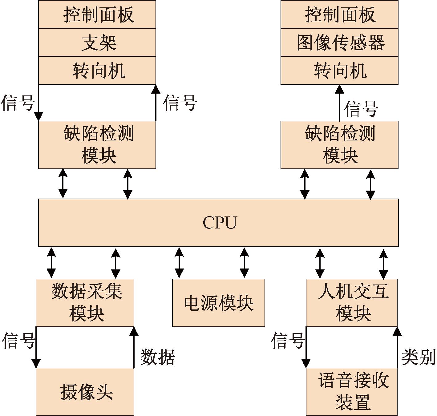 完成算法量化后,本文构建移动智能缺陷识别装置验证算法在边缘计算设备上的有效性,装置整体工作流程图如图9所示。该装置包括NVIDIA Jetson Xavier NX边缘计算板、基于STM的控制板、摄像头、支架、蓝牙通信与采集模块、语音交互装置,以及Robot Operating System、OpenCV3.4、TensorFlow2.0、Caffe、Darknet等开发工具和框架。