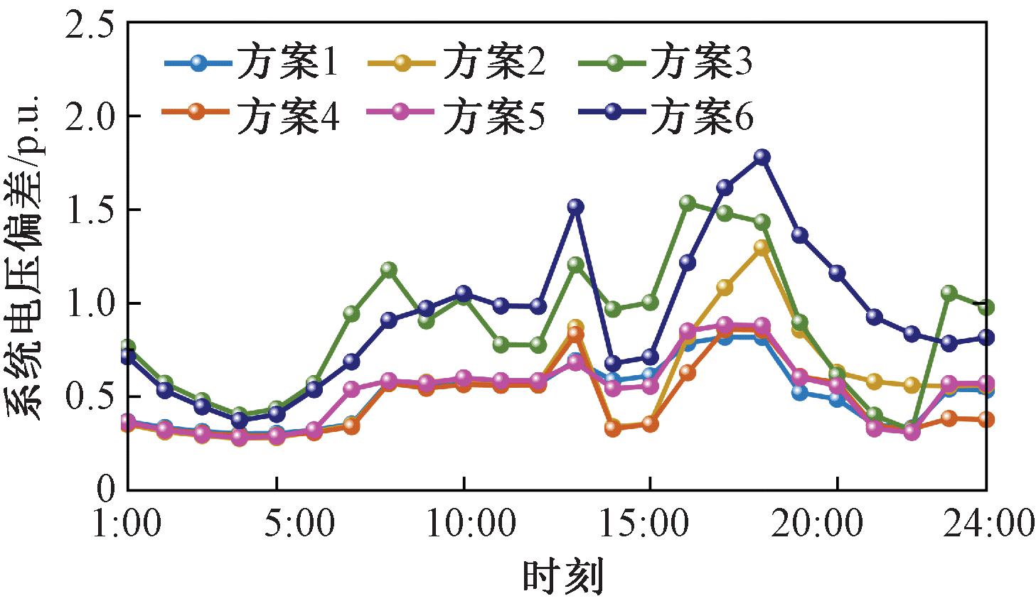 由电压偏差对比分析可知,相比于原始系统,前5个方案一天的电压偏差都有不同程度降低:电压偏差分别减少9.76,8.41,10.49,1.28,9.30 p.u.,分别降低44.37%,38.21%,47.69%,5.84%,42.28%。其中以方案3降低电压偏差的比例最大,方案4最小:方案4中并不含有SOP装置,原有系统潮流并未改变,重载线路上压降仍然很高;方案1,2,5中,方案2未考虑需求响应,所以电压偏差较大;方案1和方案5电压偏差略高于方案3,是因为电压以约束条件的形式考虑在规划方案中,而ESS动作受制于购电成本,有时会导致电压偏差高于方案3。