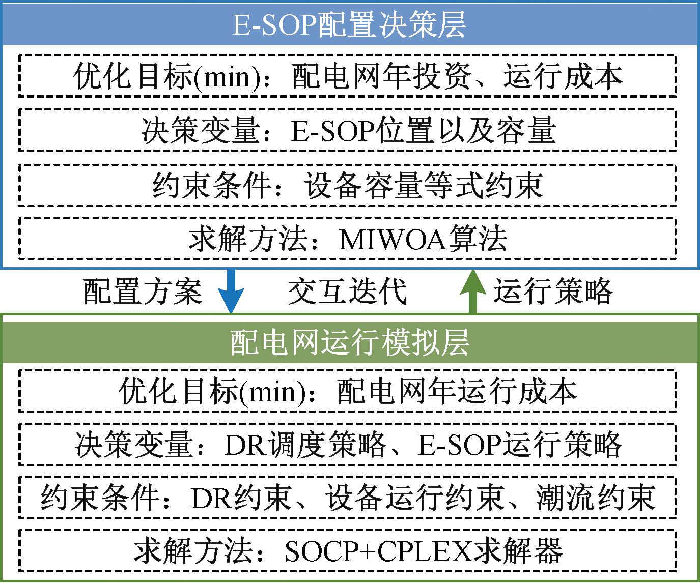 针对上述问题,本文基于已有研究成果,提出配电网三端E-SOP的双层规划模型。该模型上层以配电网年投资运维成本最小为目标,对接入电网的E-SOP进行选址定容;下层以配电网年运维费用最小为目标,考虑DR调节配电网运行。该模型采用多策略改进的鲸鱼优化算法(multi-strategy improved whale optimization algorithm, MIWOA)和SOCP的混合算法对所提模型进行求解,通过设置不同案例进行对比分析,验证所提考虑DR的配电网三端E-SOP双层规划模型的有效性。