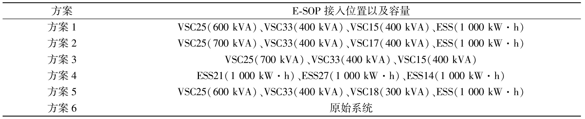方案E-SOP接入位置以及容量方案1VSC25(600 kVA)、VSC33(400 kVA)、VSC15(400 kVA)、ESS(1 000 kW·h)方案2VSC25(700 kVA)、VSC33(400 kVA)、VSC17(400 kVA)、ESS(1 000 kW·h)方案3VSC25(700 kVA)、VSC33(400 kVA)、VSC15(400 kVA)方案4ESS21(1 000 kW·h)、ESS27(1 000 kW·h)、ESS14(1 000 kW·h)方案5VSC25(600 kVA)、VSC33(400 kVA)、VSC18(300 kVA)、ESS(1 000 kW·h)方案6原始系统