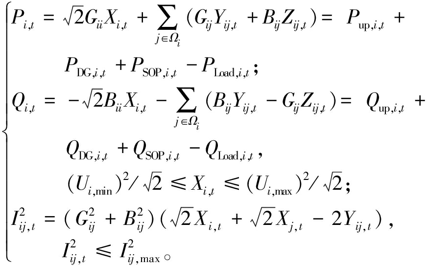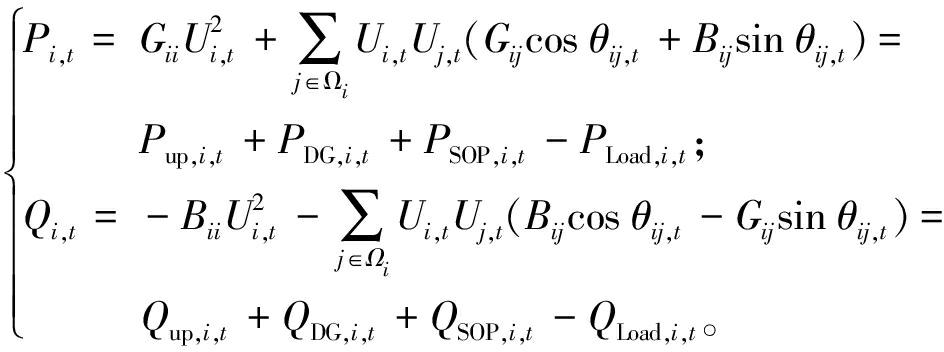 式中:Pi,t、Qi,t分别为t时刻流入i节点的有功、无功功率;Gii、Bii分别为i节点的自电导、自电纳;Gij、Bij分别为ij节点之间的互电导、互电纳;Ui,t、Uj,t分别为ij节点在t时刻的电压幅值;Ωi为与i节点相邻节点的集合;θij,t为t时刻ij节点间的相角之差;Pup,i,t、PDG,i,t、PSOP,i,t、PLoad,i,t分别为t时刻上级电网、DG、SOP、负荷输入节点i的有功功率;Qup,i,t、QDG,i,t、QSOP,i,t、QLoad,i,t分别为t时刻上级电网、DG、SOP、负荷输入节点i的无功功率。