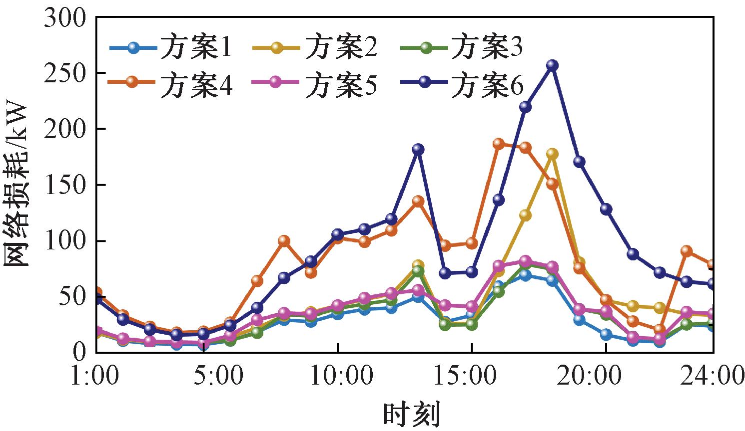 场景1下,各方案的网损如图10所示。5个方案的网络损耗相比于原始系统均有不同程度降低。分别减少1 526.31,1 111.78,1 427.78,289.36,1 354.54 kW,分别降低69.27%,50.46%,64.80%,13.13%,61.47%。其中,方案1对网络损耗的改善效果最好,方案4效果最差。由于购电费用比重大,网络损耗几乎不会影响储能的动作变化。对比方案1、2,可知DR在一定程度上也降低了网络损耗。对比方案1和方案5发现,联络开关处不能兼顾全局,网络损耗略大。