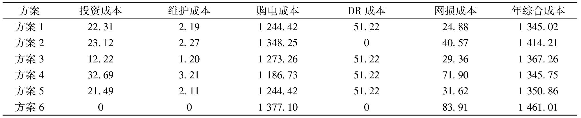 方案投资成本维护成本购电成本DR成本网损成本年综合成本方案122.312.191 244.4251.2224.881 345.02方案223.122.271 348.25040.571 414.21方案312.221.201 273.2651.2229.361 367.26方案432.693.211 186.7351.2271.901 345.75方案521.492.111 244.4251.2231.621 350.86方案6001 377.10083.911 461.01