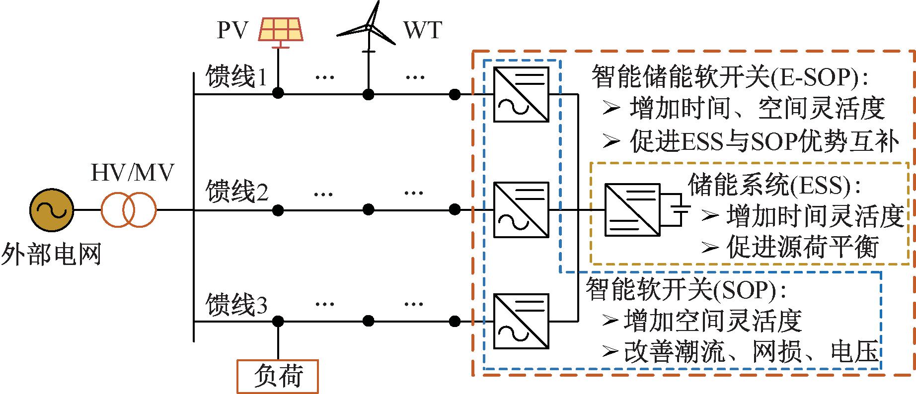 新型电力电子装置的出现为解决上述问题提供了机遇。智能软开关(soft open point,SOP)是一种可控电力电子器件,可实现馈线间的功率流动,进而改善系统潮流分布,提高配电网运行经济性[4]。相比传统联络开关,SOP可以实现馈线间的灵活连接,避免反复倒闸操作的安全隐患,提高配网灵活性以及响应速度[5]。蓄电池(energy storage system, ESS)具有价格低廉、可靠性高、技术相对成熟等特性,被广泛应用于储能设备。ESS通过能量的存储与释放,实现对负荷的“低储高发”,然而安装固定位置的储能装置,其空间调节能力有限,难以应对不同馈线上出现的问题[6]。通过DC-DC变换器与ESS组成的系统可以使SOP的直流部分接入配电网中,从而实现对多条馈线功率的调节,大大提高了其灵活性。
