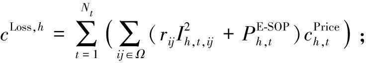 分别为DC-DC转换器容量、ESS容量和VSC容量;βE-SOP为E-SOP年运维费用系数;Nh为场景数量;Ph为场景概率;cLoss, h、cGrid, h、cDR, h分别为场景h一天的网损成本、购电成本、DR成本;Nt为划分的时段数;rij为支路ij的阻抗;Ih,t,ij为支路ij在t时刻的电流;