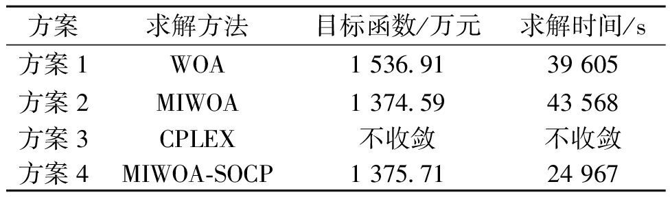 方案求解方法目标函数/万元求解时间/s方案1WOA1 536.9139 605方案2MIWOA1 374.5943 568方案3CPLEX不收敛不收敛方案4MIWOA-SOCP1 375.7124 967