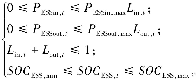 式中:PESSin,max、PESSout,max分别为最大充、放电功率;Lin,t、Lout,t分别为在t时刻进行充放电的0-1变量,充电时Lin,t为1,Lout,t为0,放电时Lin,t为0,Lout,t为1;SOCESS,max、SOCESS,min分别为SOC的最大、最小值。
