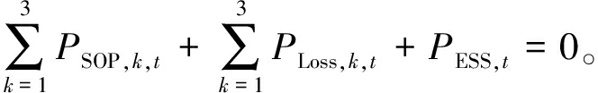 式中:PSOP,k,t 、QSOP,k,t分别为端口k在t时刻流过的有功、无功功率;SSOP,k,max为SOP端口容量最大值。运行时,ESS出力、SOP各端口出力以及SOP端口损耗之和为0: