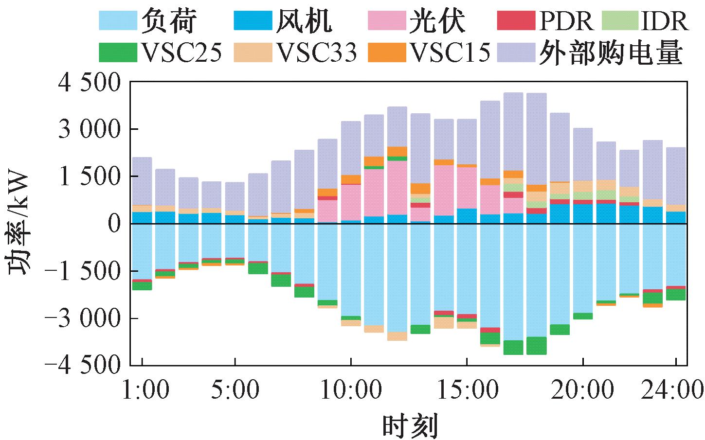 由于系统采用统一售电电价进行规划,故DR的响应方案基本不变。ESS作为配电网扩展收益的主要对象,在电价低时充电,电价高时放电。各个VSC端口以网络损耗最小为目标进行功率调控。值得说明的是,各个VSC端口的功率值和本就等于储能的运行功率,因此储能的部分不再额外标注。